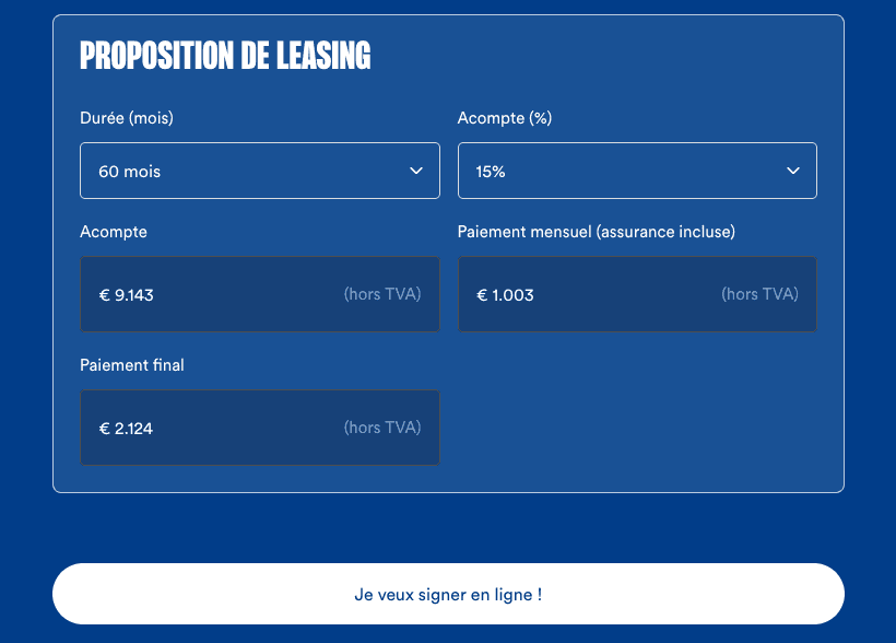 Si vous acceptez, vous pouvez signer immédiatement en ligne. Votre contrat vous sera ensuite envoyé par e-mail et vous pourrez commencer à profiter de votre nouveau véhicule ou de votre nouvelle machine.
